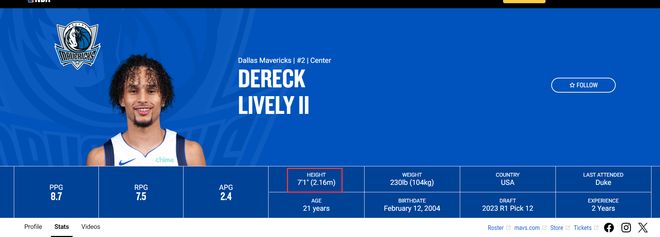 打开NBA官网,莱夫利的注册身高依旧是7尺1(2.16米),并没有因为他说自己长高就真的改了尺寸,所以我才想问这些数值是真的吗?
